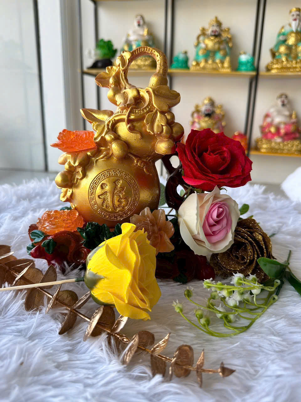Bình hồ lô hay một bầu rượu là biểu tượng đầy quyền năng của cuộc sống trường thọ, may mắn và dào dạt phước lành. Ta thường thấy trong tranh ông Thọ, có hươu và hạc đi theo, đồng thời vị tiên này cũng mang theo một bầu rượu mà dân gian vẫn cho rằng nó chứa rượu trường sinh bất tử.